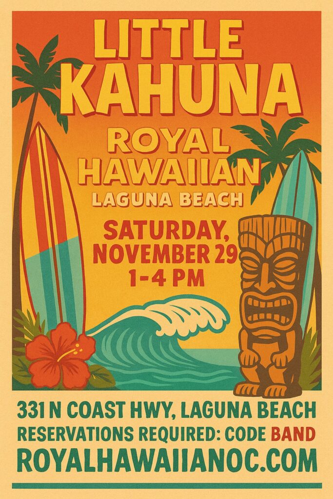 Royal Hawaiian, Saturday November 29, 1-4 PM. Reservations Necessary…www.RoyalHawaiianOC.com Code Band. 331 N Coast Hwy, Laguna Beach